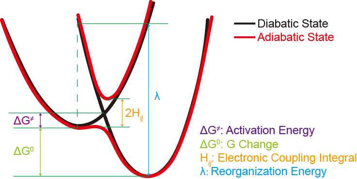 \[\Delta G^\ddagger = \frac{(\lambda + \Delta G^0)^2}{4\lambda}\]这个公式解决了活化能的问题,不过到达反应构型后,电子态的跃迁概率问题还没有解决。如果两个电子态之间没有耦合,那么即使到达反应构型也是不能发生跃迁的。于是引入了电子耦合积分$H_{ij}$来量化描述初态$\Psi_R$和末态$\Psi_P$的耦合: